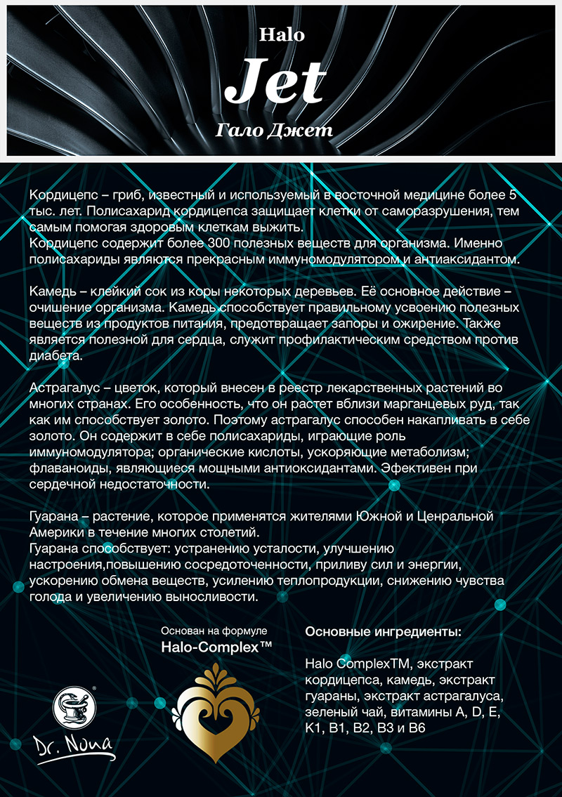 Основные ингредиенты: Halo Complex™, экстракт кордицепса, камедь, экстракт гуараны, экстракт астрагалуса, зеленый чай, витамины A, D, Е, К1, В1, В2, ВЗ и В6.