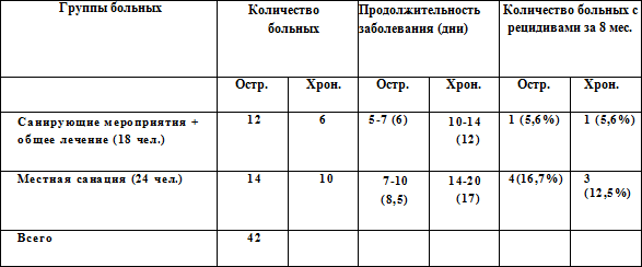 1. У пациентов, прошедших полный курс комплексного лечения (местное и общее), по сравнению с группой больных, которым были проведены только местные санирующие мероприятия, сокращалась продолжительность болезни и уменьшалось число рецидивов.